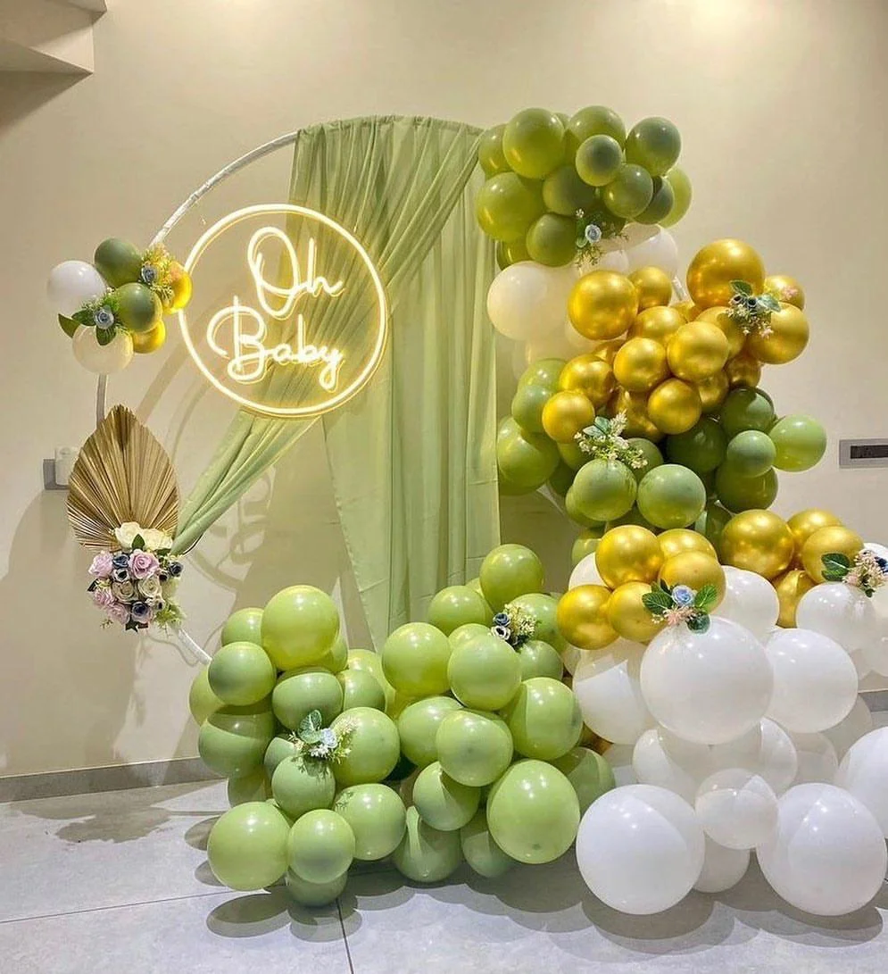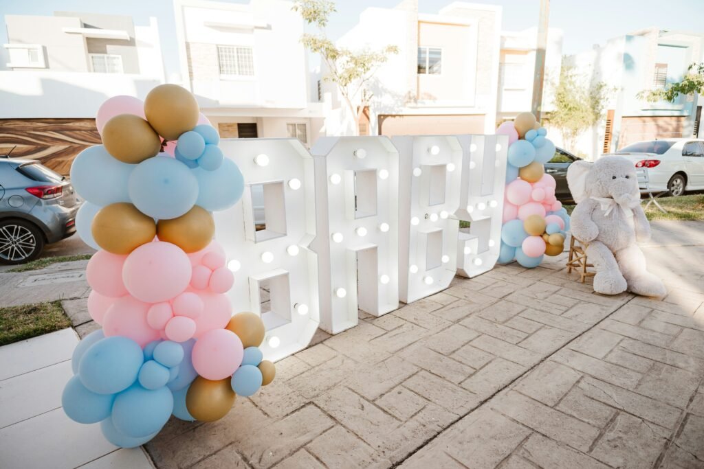 Soft color themes, welcome baby setups, balloon walls, and customized baby shower decor.